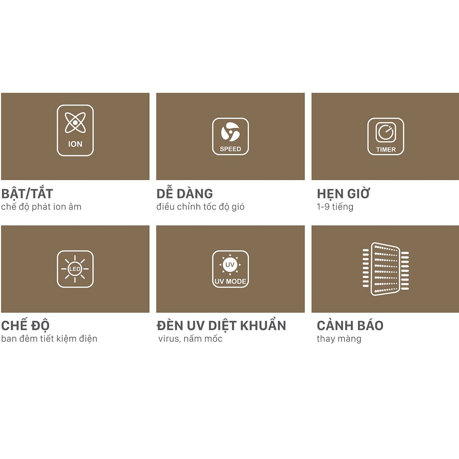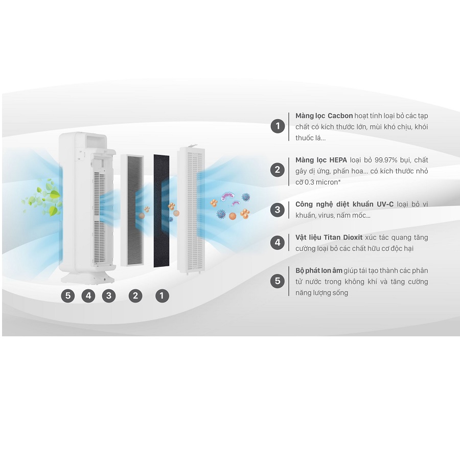 - Cấp lọc: Cacbon, HEPA, Titan Dioxit, UV, Ion âm